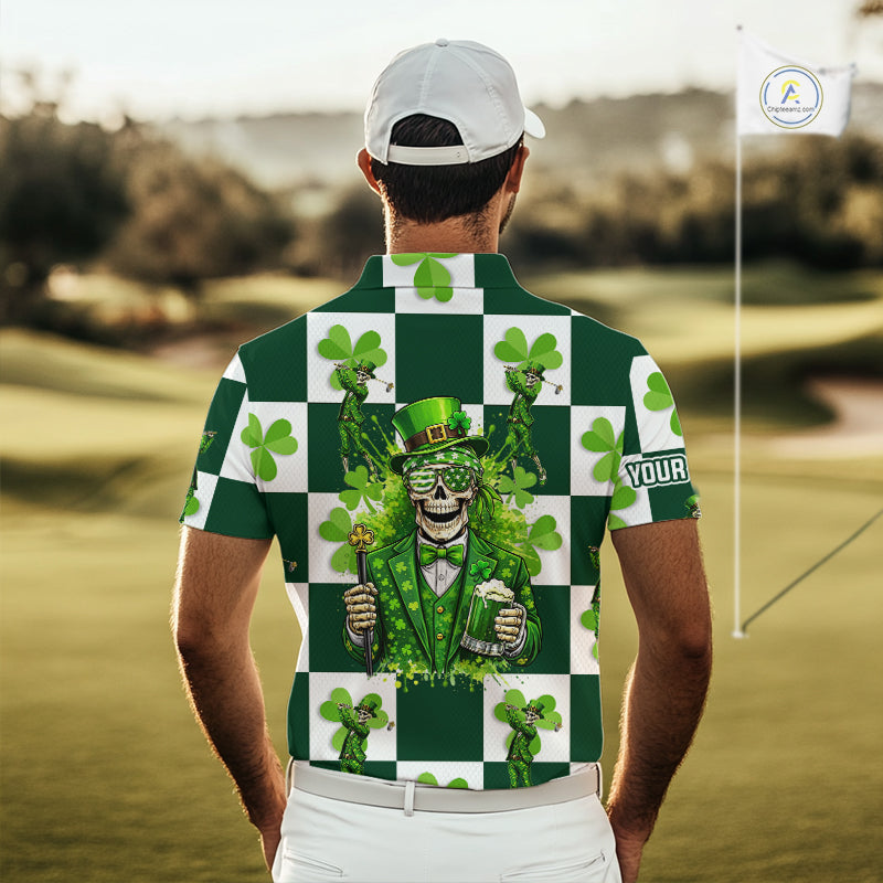 Funny Skull drink beer Clover square pattern Mens Golf Polo shirts Custom St Patrick's Day golf tops NQS11454