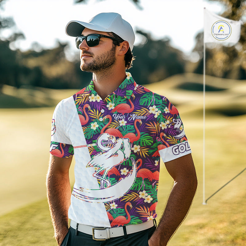 Men Golf Polo Shirts Colorful Floral Flamingo Pattern Tropical Leaves Custom Name Team Golf Shirts NBT524