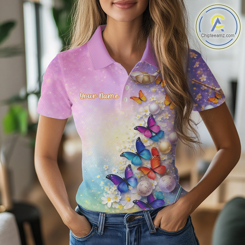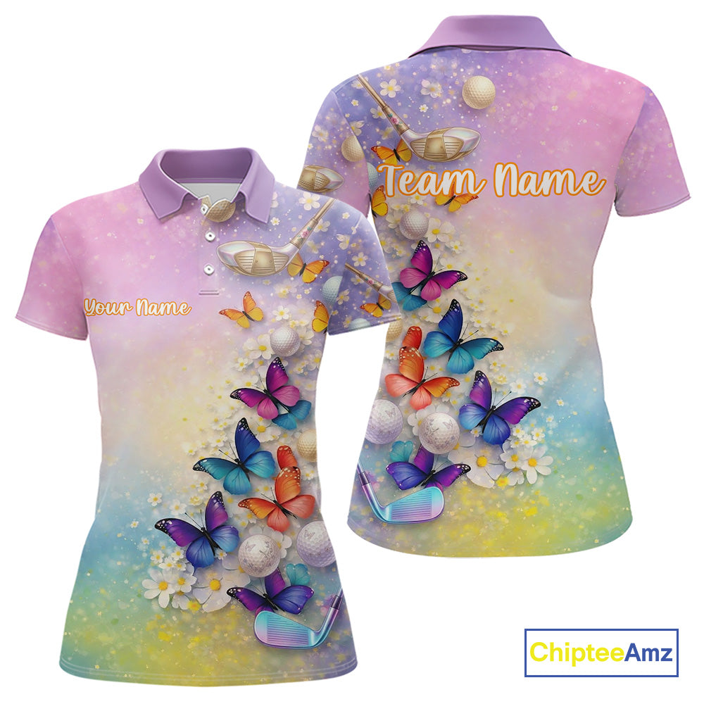 Colorful Butterfly Womens Golf Polo Shirt Custom Name Floral Watercolor Golf Shirts NYN2905