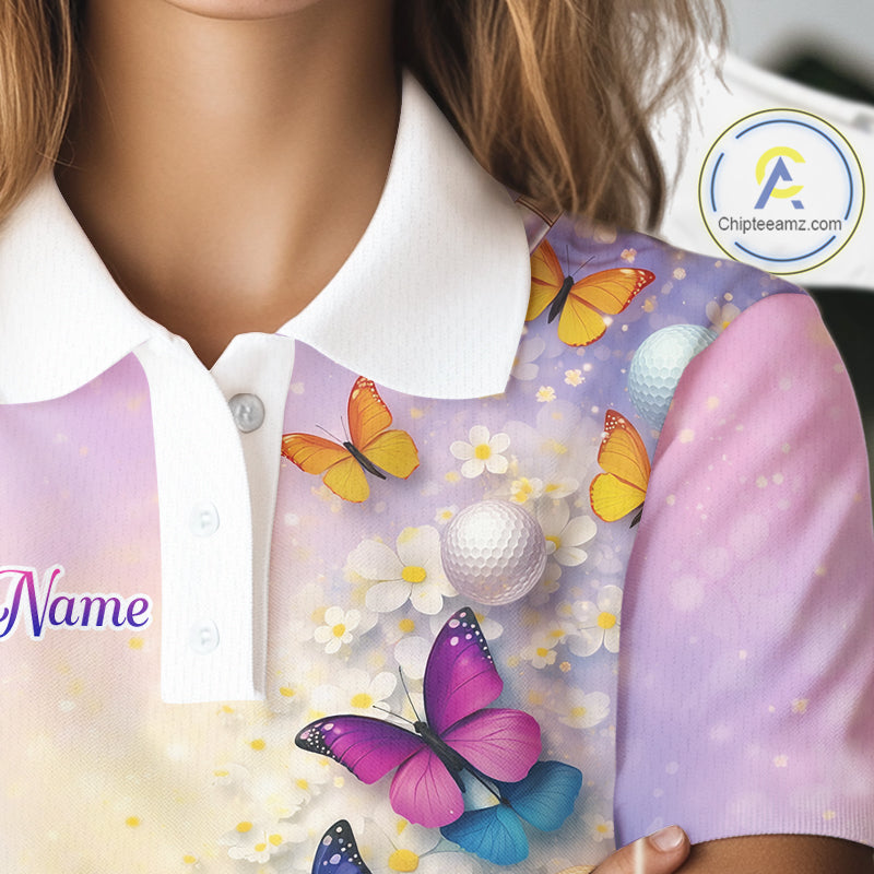 Colorful Butterfly Womens Golf Polo Shirt Custom Name Floral White Golf Ball Clothes Jerseys NYN2911