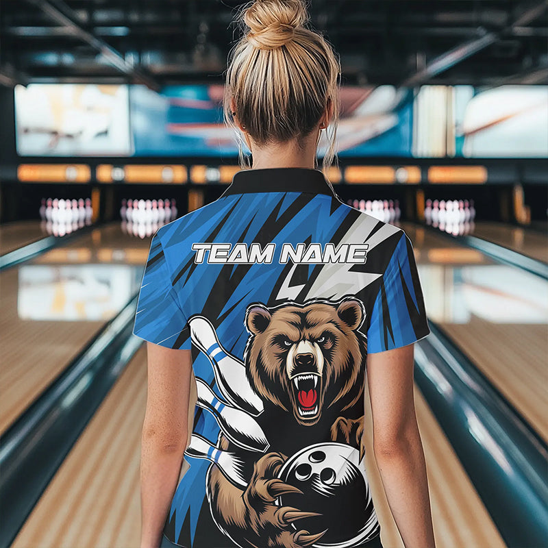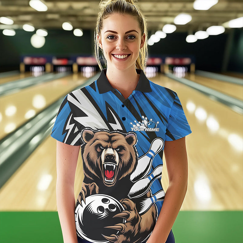 Personalized Bear Bowling Polo Shirt For Women, Bear Bowling Team Blue Bowling League Shirt IPHW8829