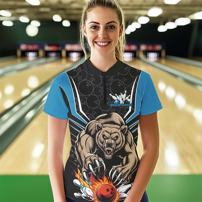 Black And Blue Custom Bear Bowling Jerseys, Bear Bowling Team Quarter-Zip Shirts For Women IPHW8833
