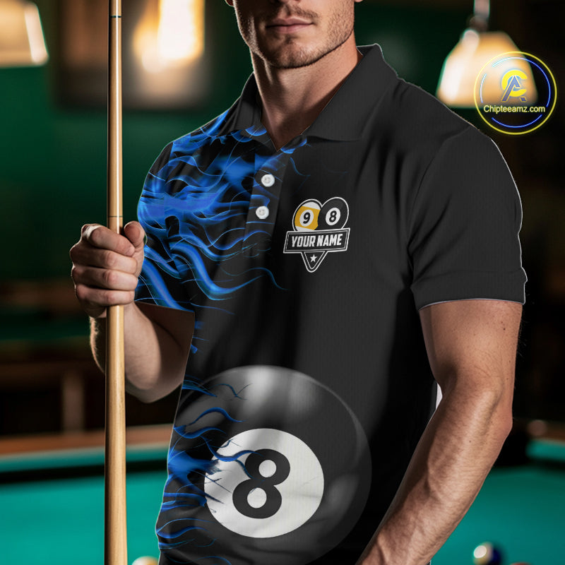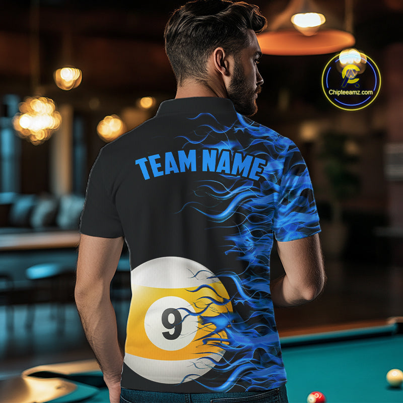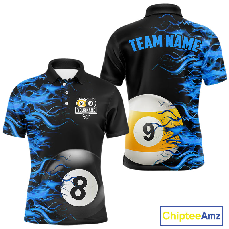 Blue Flaming 8 Ball & 9 Ball Billiard Shirt For Men Custom Pool Team Jersey Polo & 1/4 Zip TDM4377