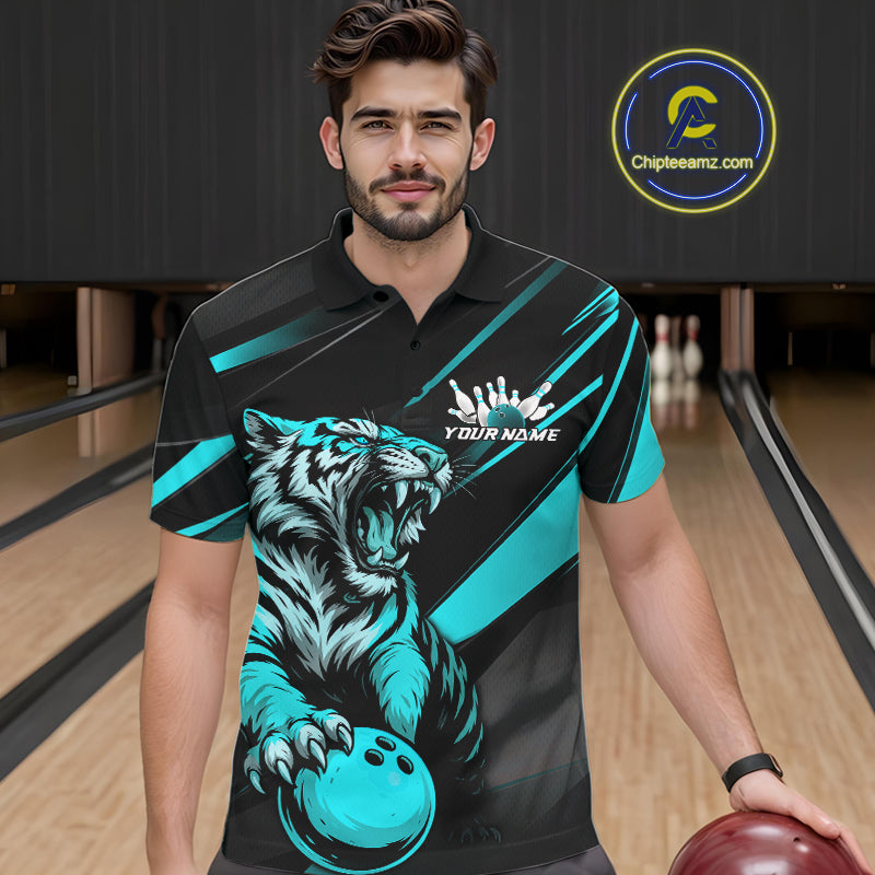 Personalized Tiger Bowling Team Men Polo Shirts, Black And Blue Tiger Bowling Jerseys IPHW9023