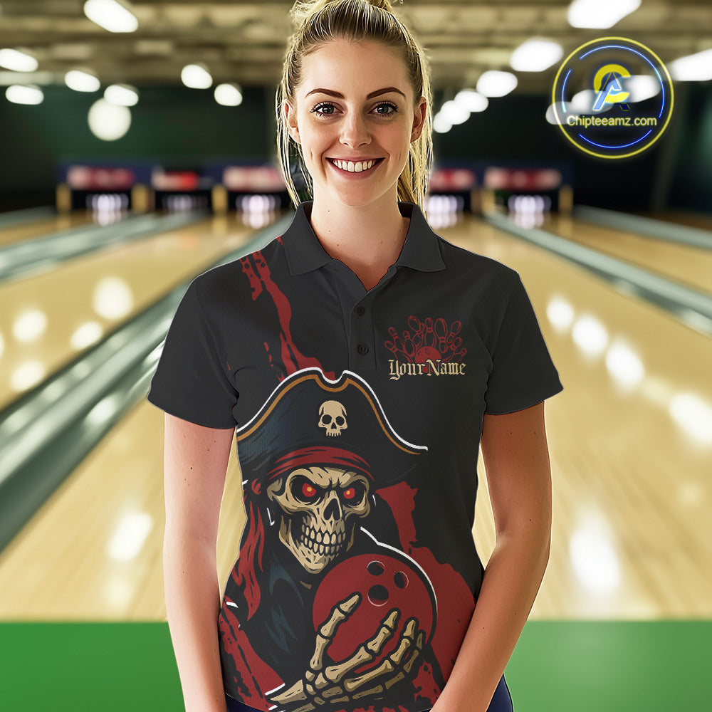 Custom Black And Red Pirate Bowling Women Polo Shirts, Bowling Team Bowling League Shirt IPHW9048