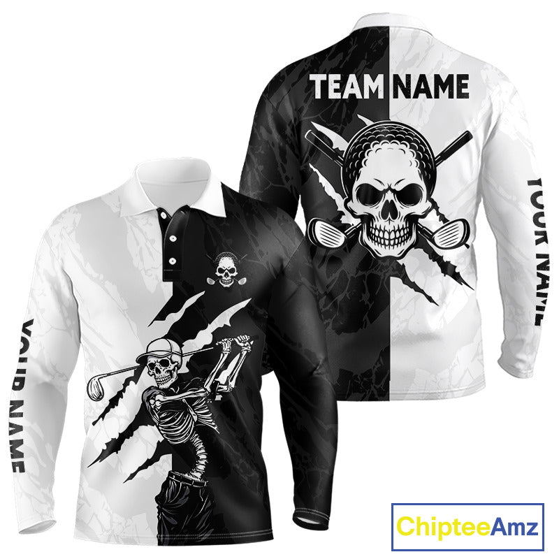 Black And White Funny Skull Long Sleeve Golf Polo Shirts Custom Camo Skull Playing Golf Shirt Golf Gifts NHN0047