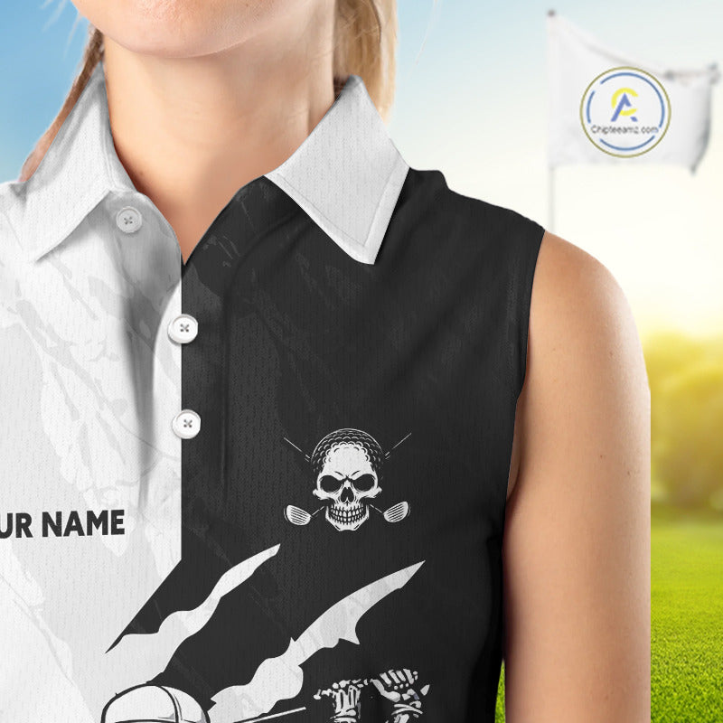 Funny Skull Golf Sleeveless Polo Shirt Custom Black And White Camo Pattern Golf Attire For Women NHN0047