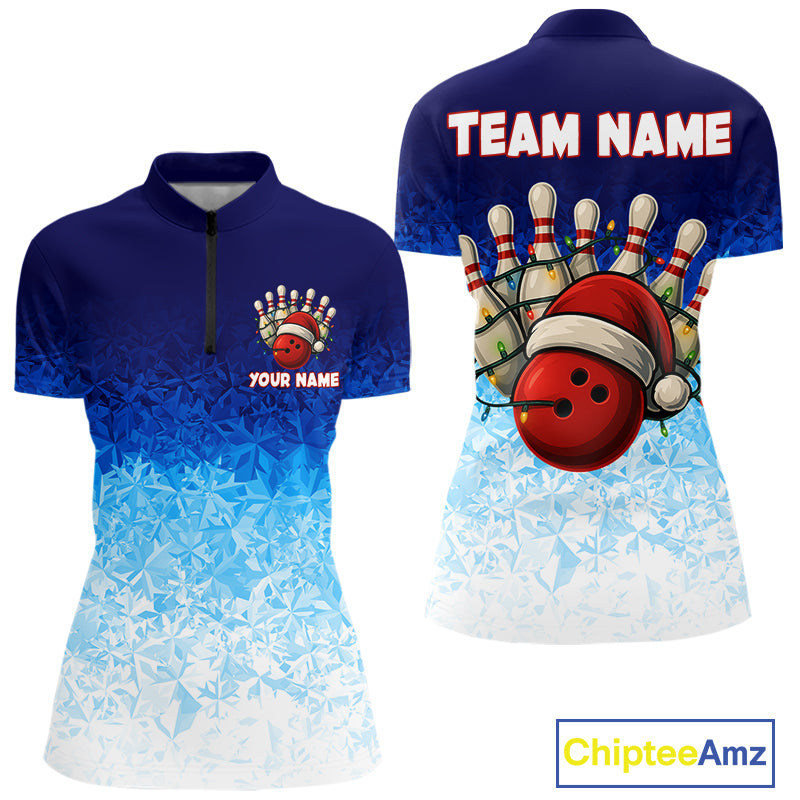 Blue Ice pattern Christmas Team Bowling Polo, Quarter Zip shirts for Women Custom Xmas bowling gifts NQS10969