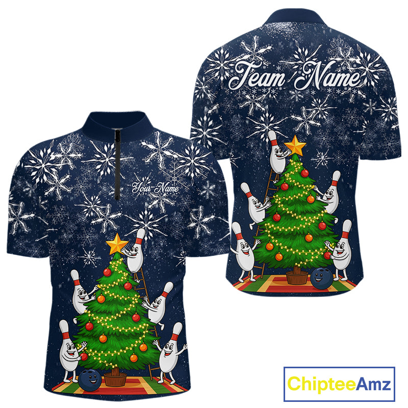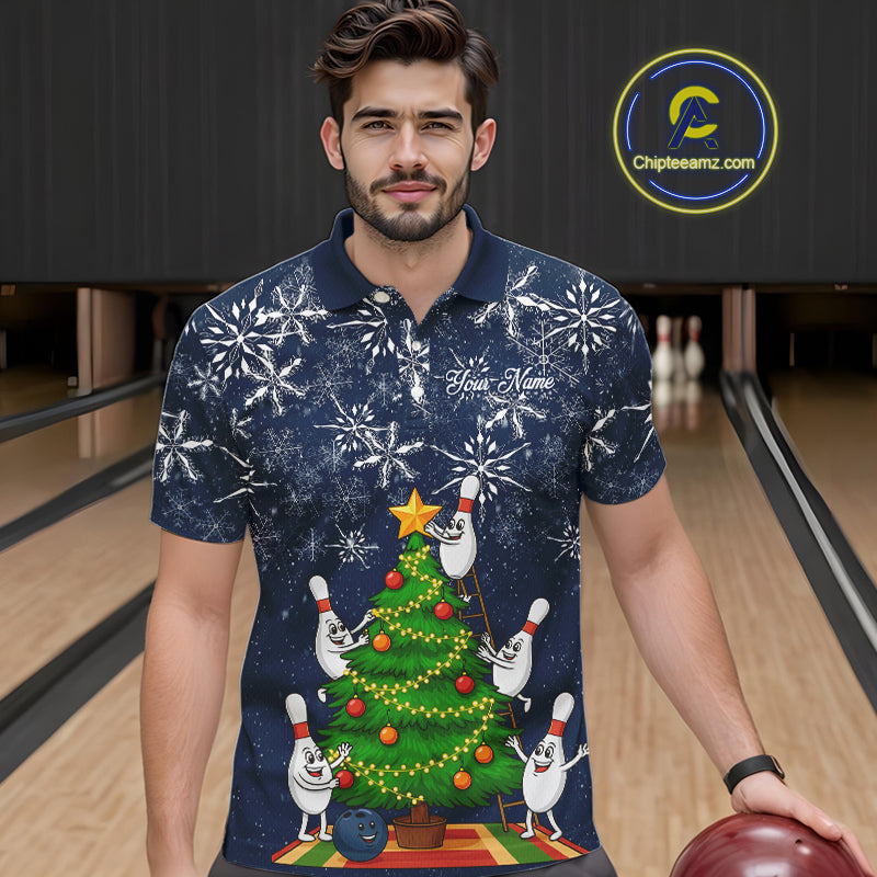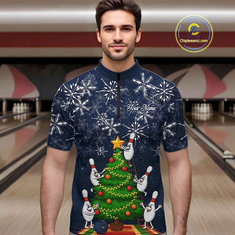 Funny Christmas Tree snowflake Bowling shirts for men Custom Xmas Bowling Outfits Men | Navy NQS10951