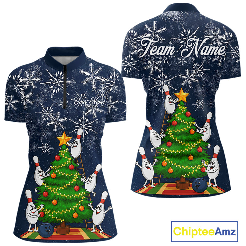 Funny Christmas Tree snowflake Bowling shirts for Women Custom Xmas Bowling outfits for women | Navy NQS10951