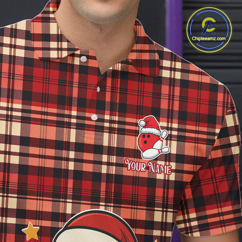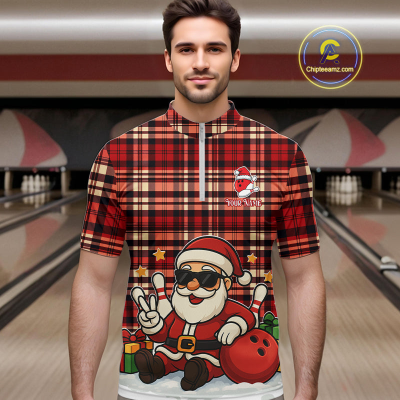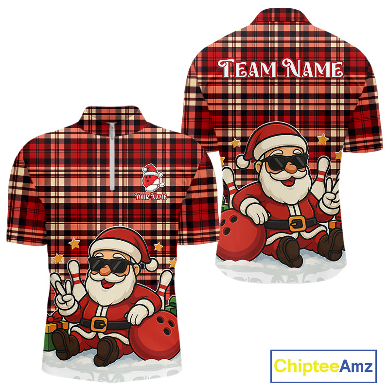 Funny Santa Christmas Bowling Polo, Quarter Zip shirts for men Custom Red Plaid bowling jerseys men NQS10957