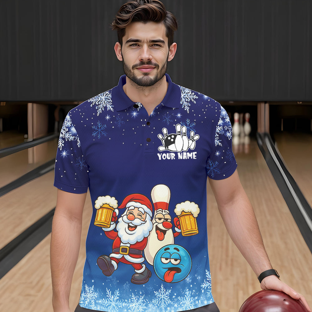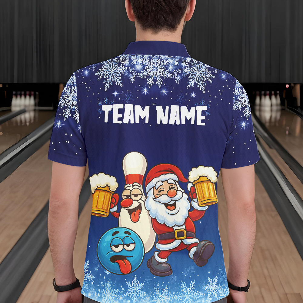 Funny Santa Drink Beer Blue snowflake Bowling Shirts For Men Custom Christmas Bowling Team Jerseys NQS11056