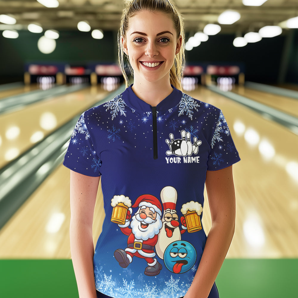 Funny Santa Drink Beer Blue snowflake Bowling Shirts For Women Custom Christmas Bowling Team Jerseys NQS11056