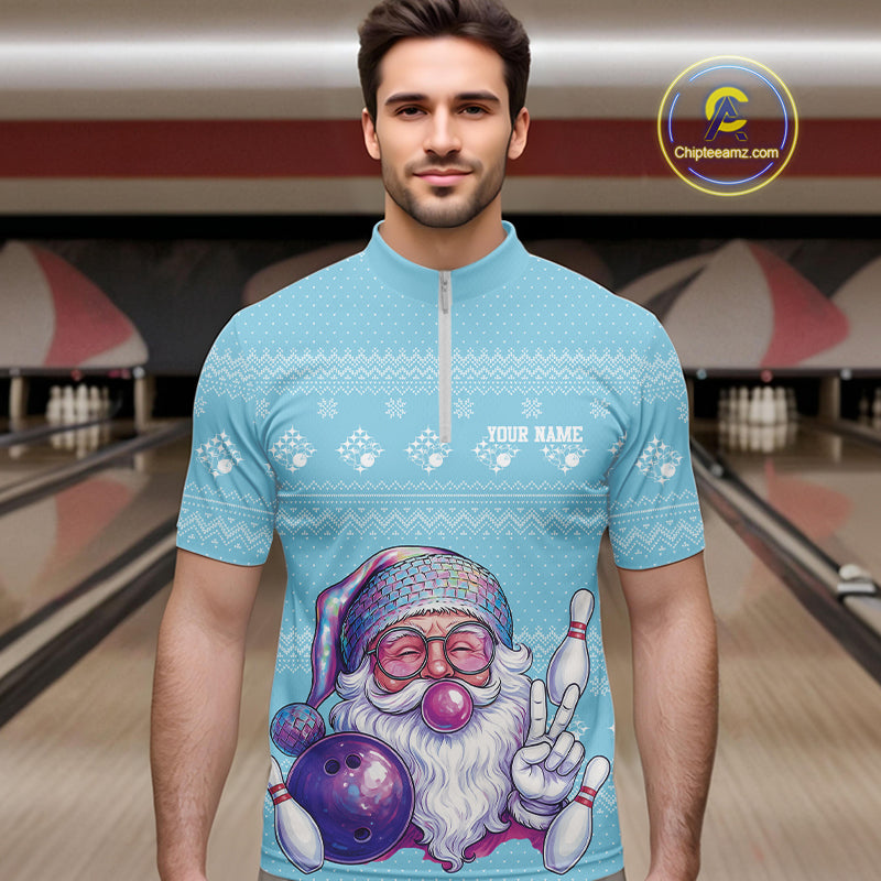 Custom Funny Santa Christmas Men Bowling Quarter-Zip Shirts, Light Blue Xmas Team Outfit IPHW10142