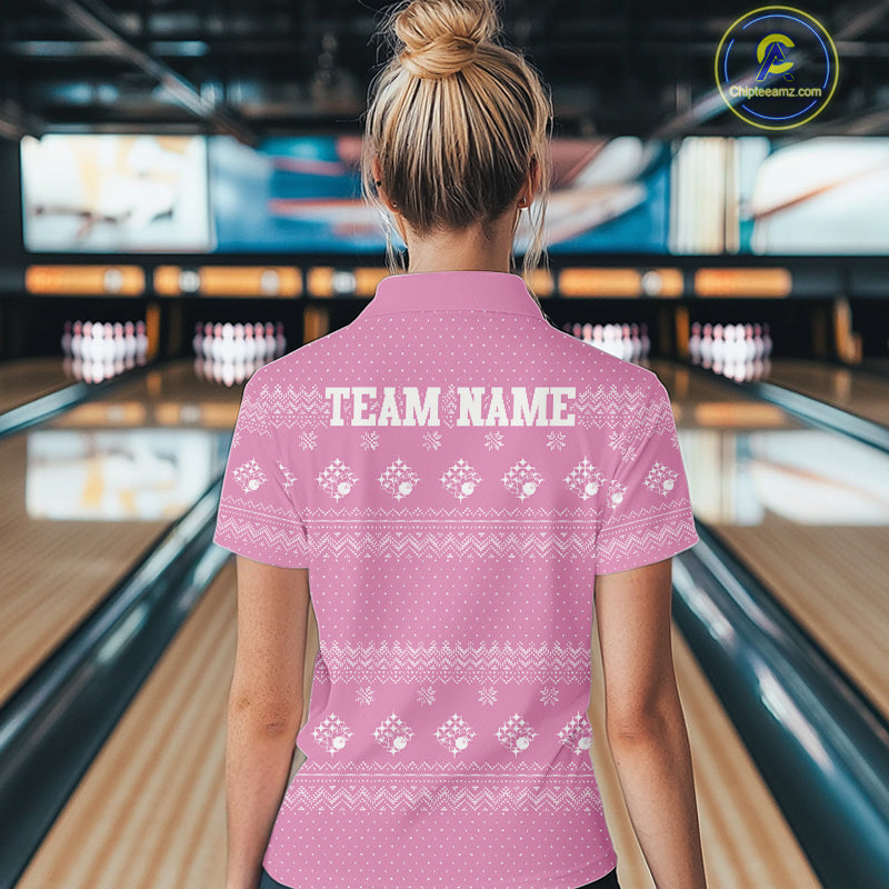 Custom Funny Santa Christmas Women Bowling Quarter-Zip Shirts, Pink Xmas Team Outfit IPHW10140