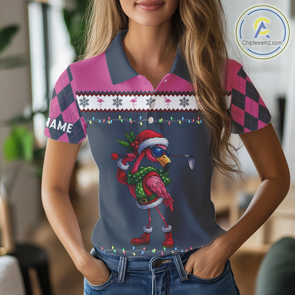Pink argyle pattern Funny Christmas Flamingo Womens golf polo shirt custom golf attire for ladies NQS11088