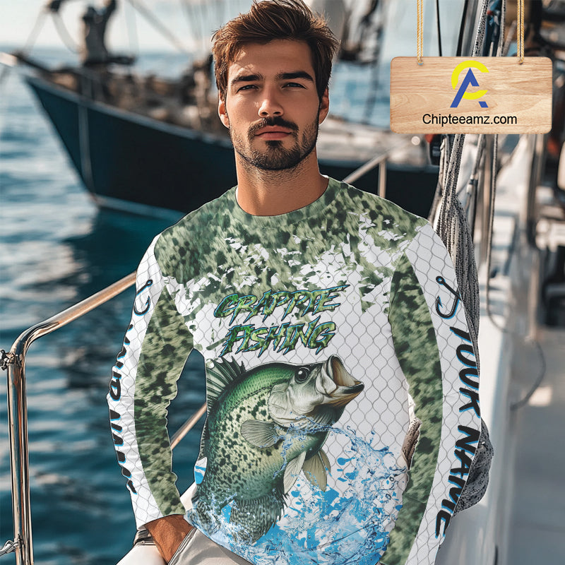 Crappie fishing green scales UV protection custom hooded sun shirt, Crappie fishing jerseys NQS10228
