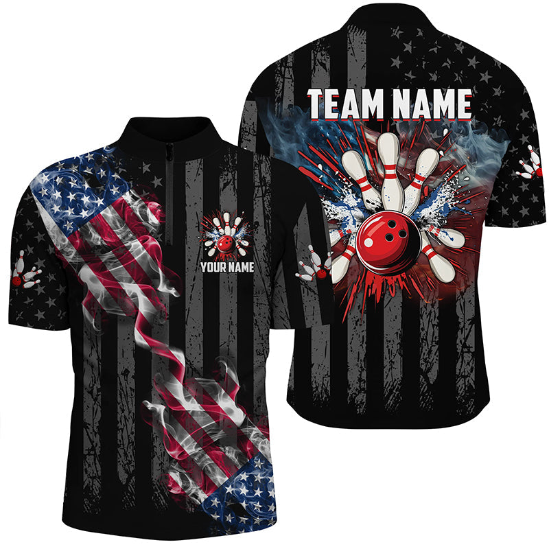 Black American flag smoke Bowling Polo, Quarter Zip shirt For Men Custom Patriotic Team Bowling Jersey NQS7689