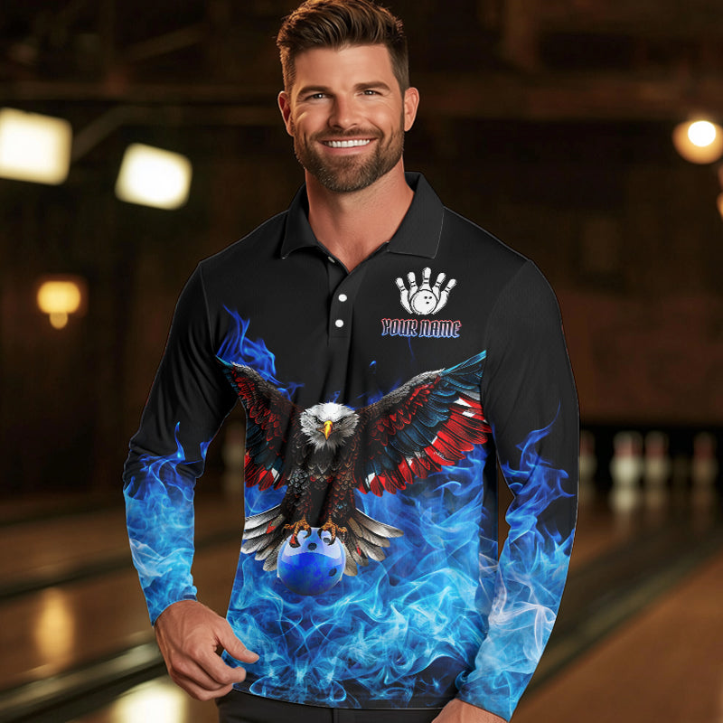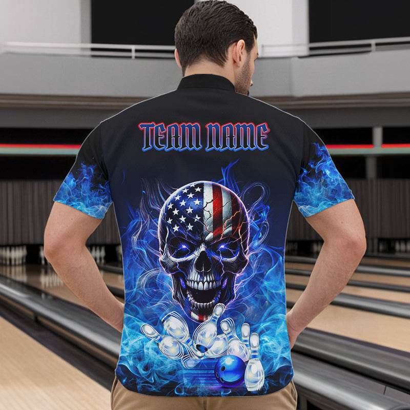 Blue Flame Smoke American Flag Eagle Skull Mens Bowling Shirts Custom Patriotic Bowling Team Jersey NQS9659