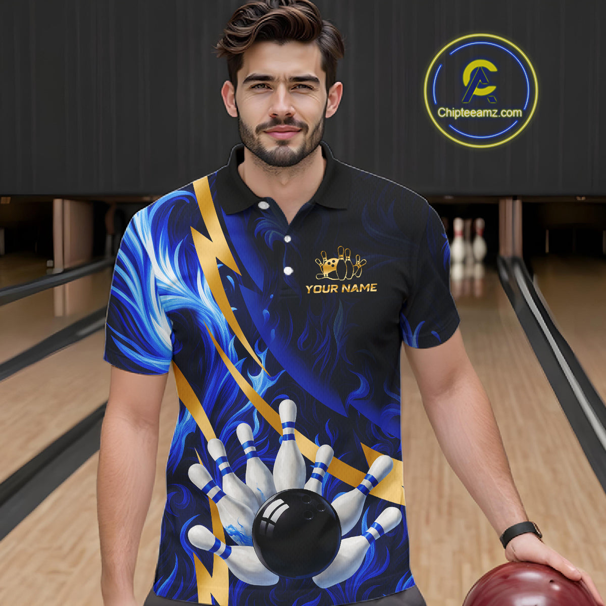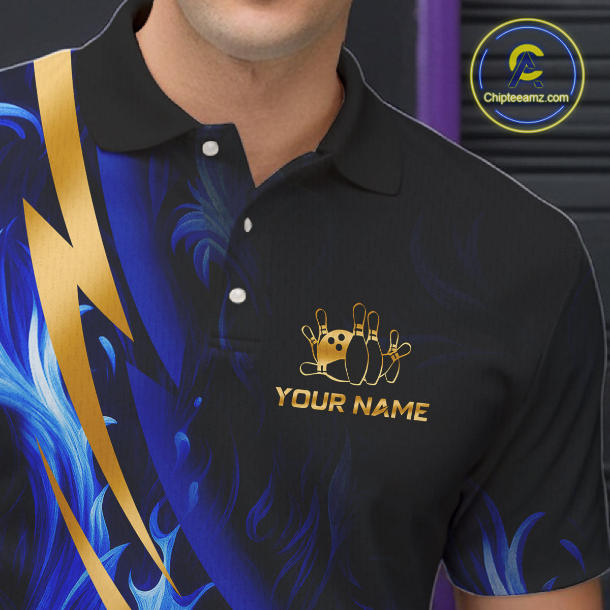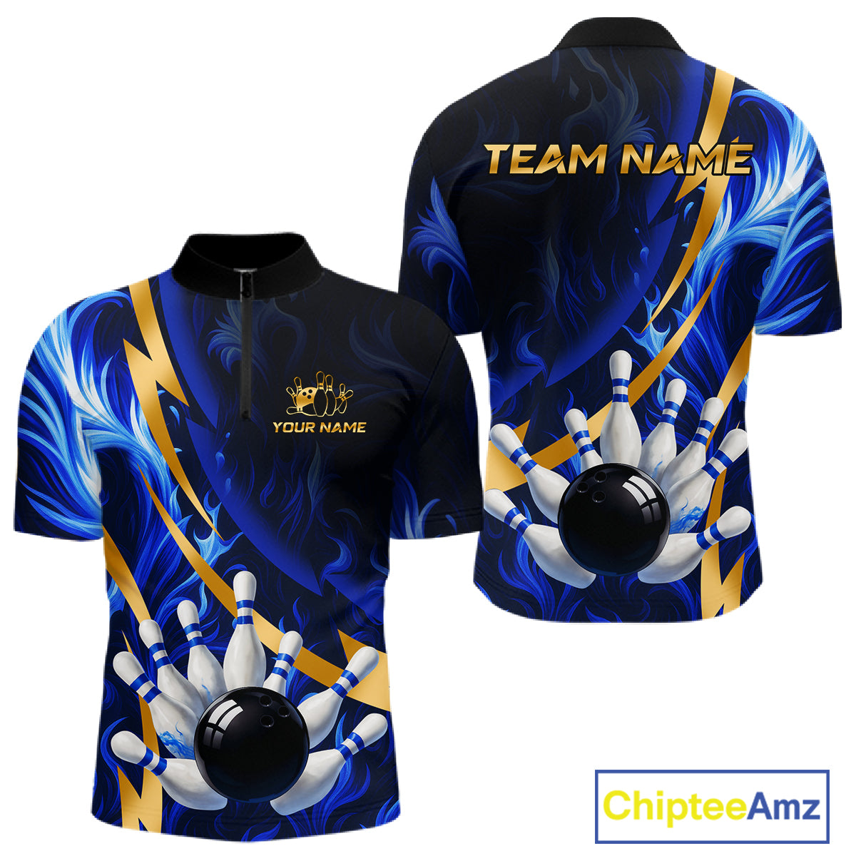 Personalized Bowling Polo, Quarter Zip Shirts for Men Custom Blue Flame and Gold Bowling Team Jersey NQS10446
