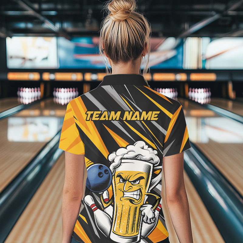 Custom Black Yellow Funny Beer Bowling Women Polo Shirt, Angry Beer Glass Bowling Jersey IPHW8933