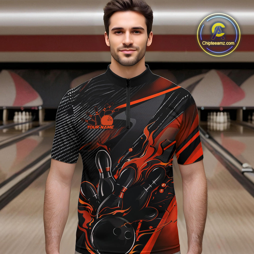 Custom Black And Orange Flame Bowling Team Men Quarter-Zip Shirts, Fire Bowling Jerseys IPHW9780