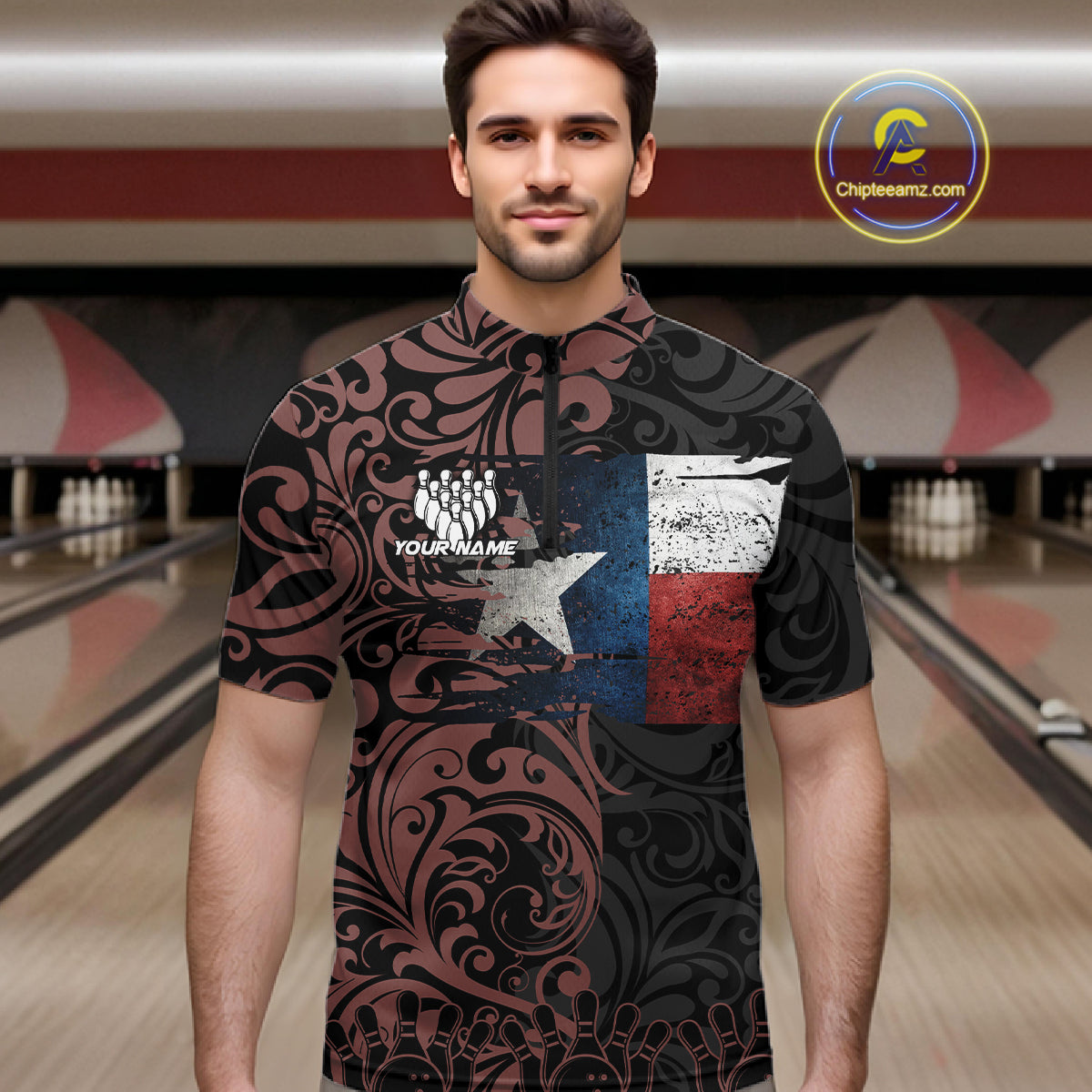 Texas Flag tribal pattern Bowling Polo, 1/4 Zip shirts for men Custom patriotic Team bowling jersey NQS10583