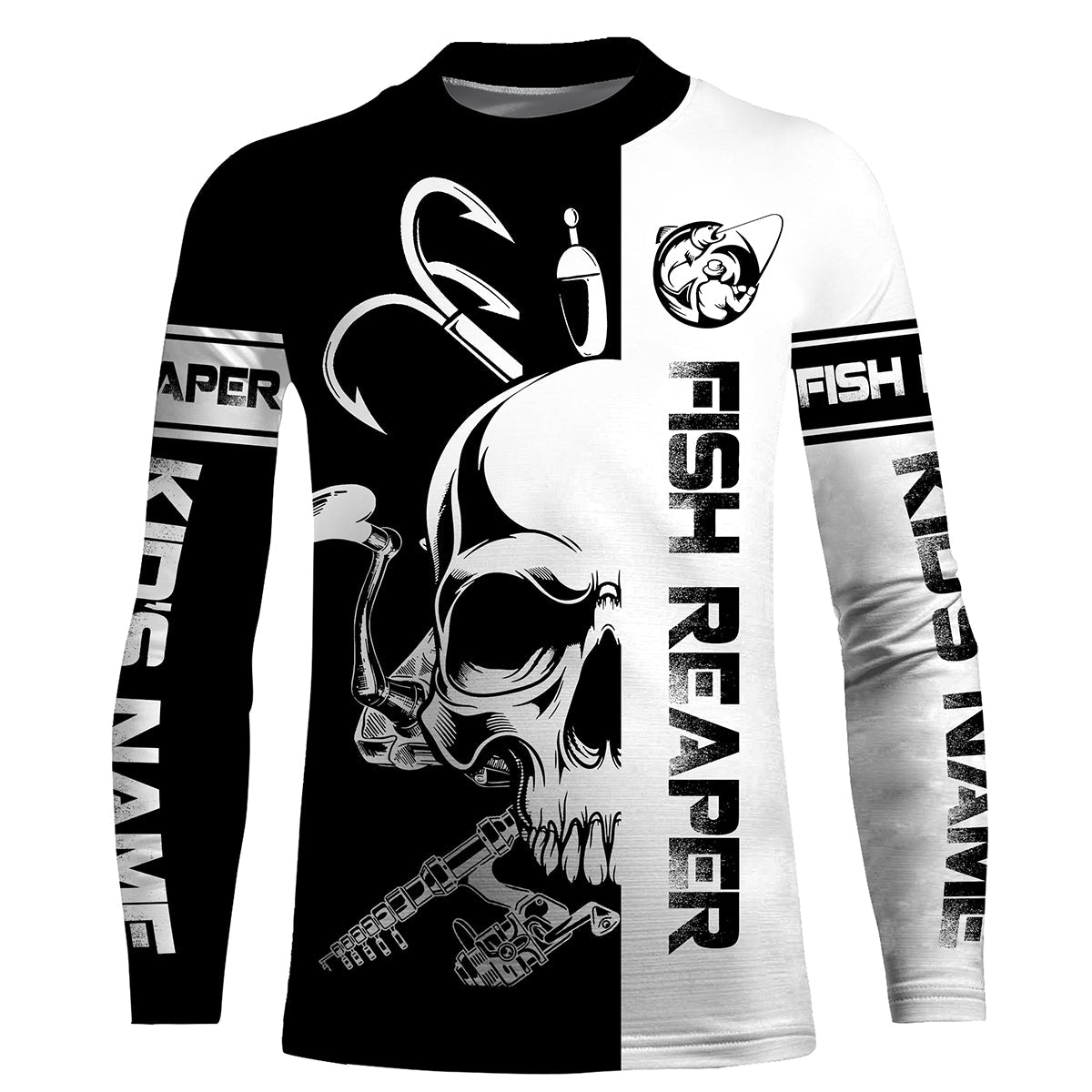 Fish reaper fishing black and white Custom Name 3D UV Protection fishing Shirts, fishing apparel NQS3023