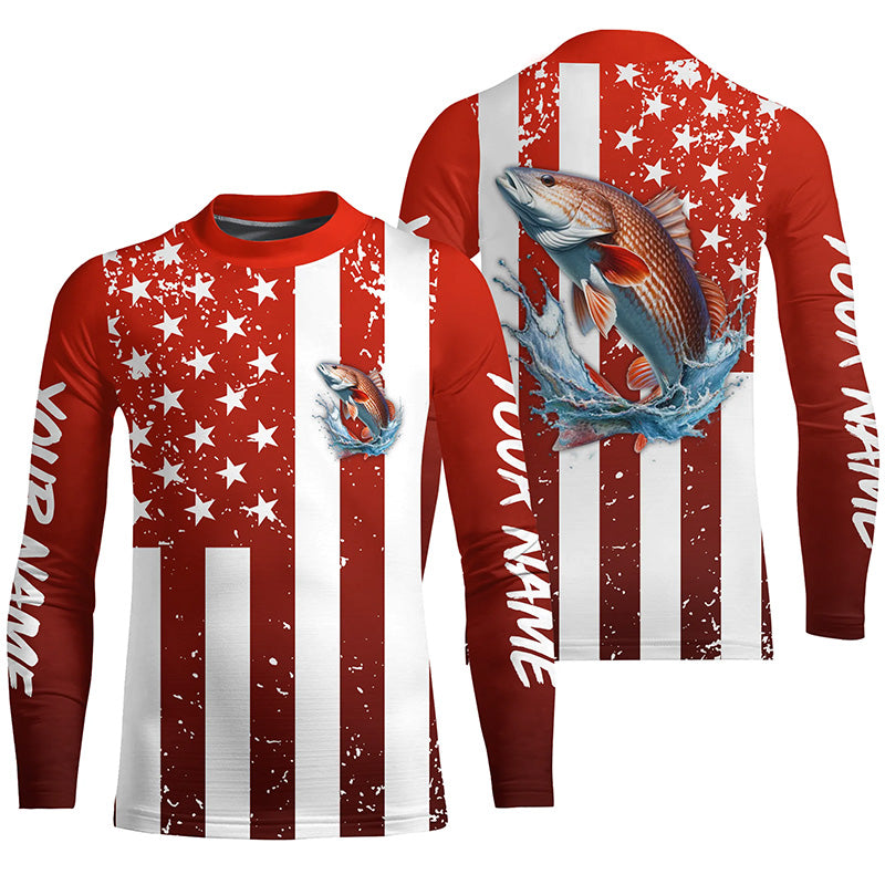 Custom Redfish Long Sleeve Tournament Fishing Shirts, Grunge American Flag Patriotic Fishing Shirts IPHW5604