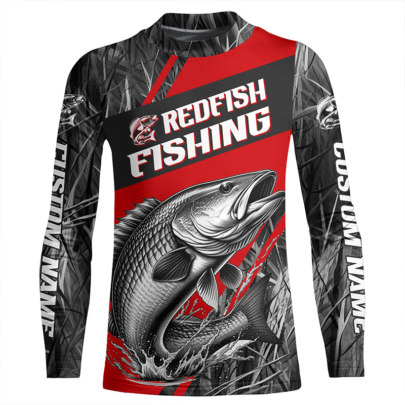 Black And Red Camo Redfish Long Sleeve Tournament Fishing Shirts, Custom Redfish Fishing Jerseys IPHW6316