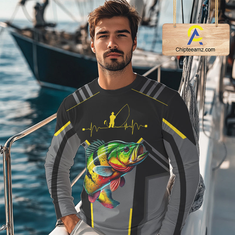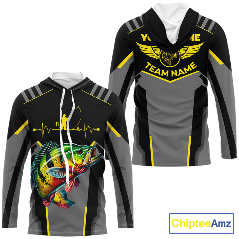 Personalized Black Peacock Bass Fishing jersey, Team Bass Fishing Long Sleeve tournament shirt| Yellow NQS9823