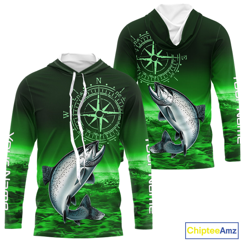 Personalized Salmon Green Performance Fishing Shirts, compass Salmon fishing tournament Shirts NQS10237