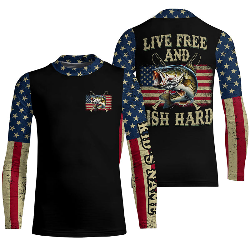 Live Free and Fish Hard American Flag Bass fishing Custom Name 3D All over printed Fishing gift NQS2521
