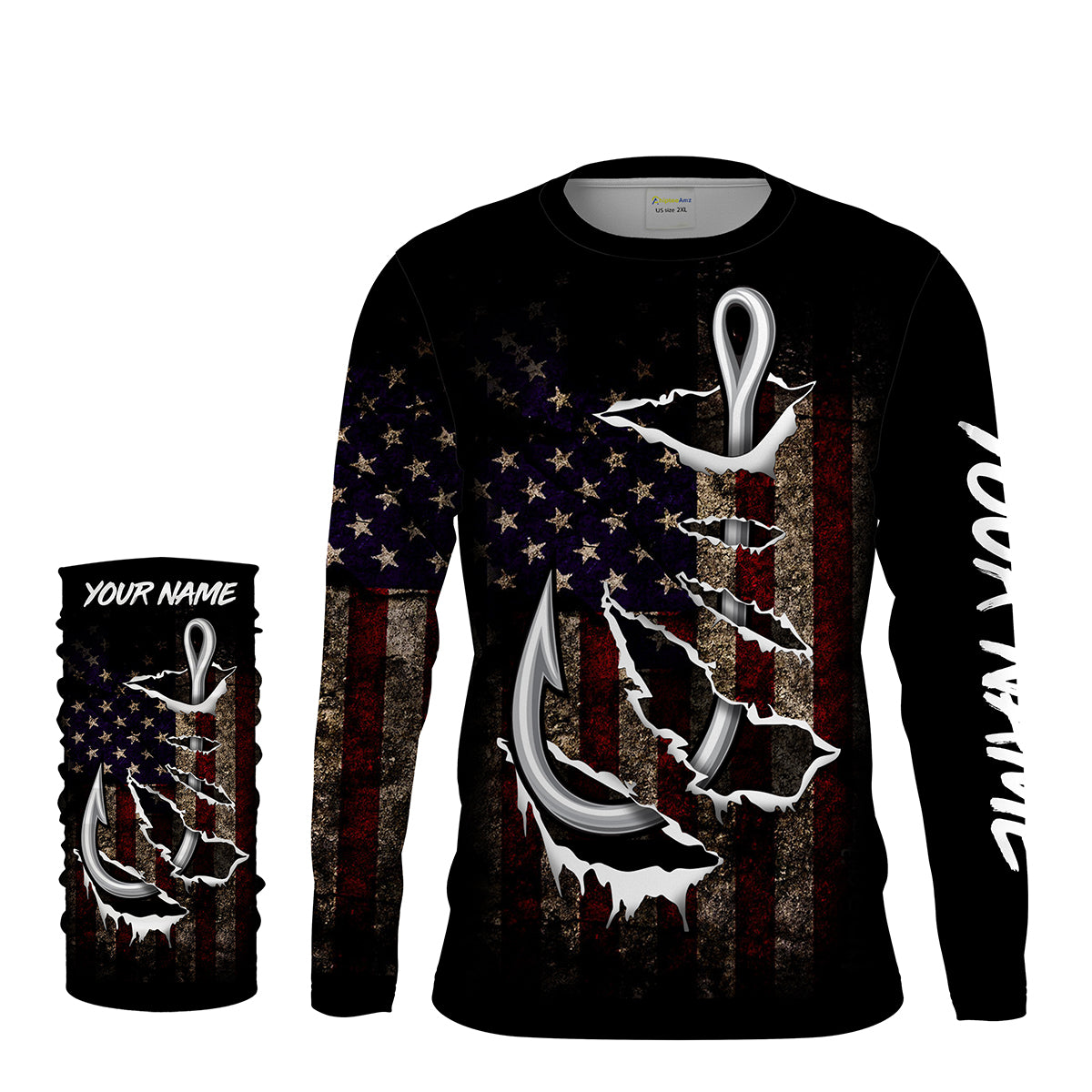 US Fishing 3D Fish Hook American Flag patriotic UV protection customize name long sleeves shirts UPF 30+ fishing apparel NQS2161
