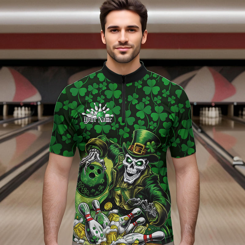 Custom Funny Saint Patricks Day Skull And Beer Bowling Quarter-Zip Shirt For Men, Lucky Team Shirt IPHW8607