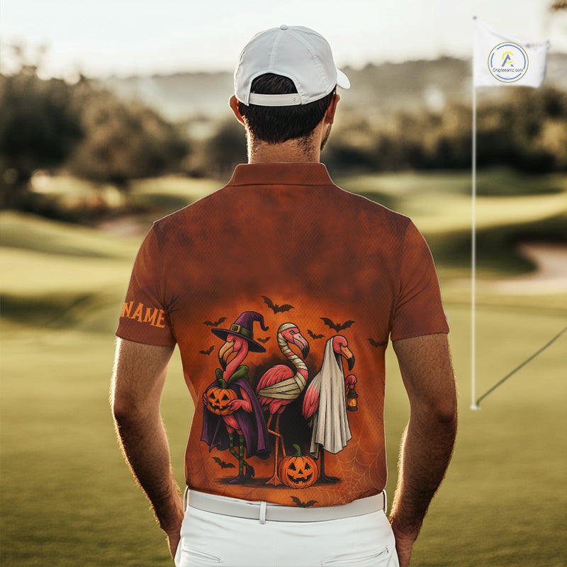 Funny Flamingo Pumpkin Golf Polo Shirt For Men Custom Halloween Golf Tops | Orange NQS10702