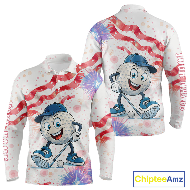 Funny Golf Ball Watercolor red, white and blue Mens golf polo shirts custom patriotic fun golf shirts NQS10293