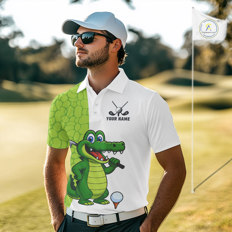 Green and White Funny Alligator Golf Polo Shirt For Men Custom men's golf apparel funny golf gifts NQS10738