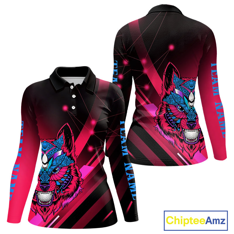 Funny Pink Wolf Womens Long Sleeve Polo Golf Shirts Custom Golf Ball Golf Shirt For Team Jersey NHN0056