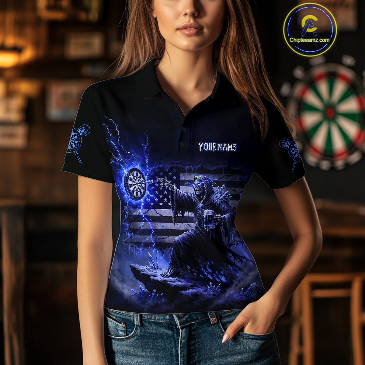 Custom Lightning Blue Grim Reaper Beer Funny Women Darts Polo Shirt US Flag Dart Jerseys NYN1838