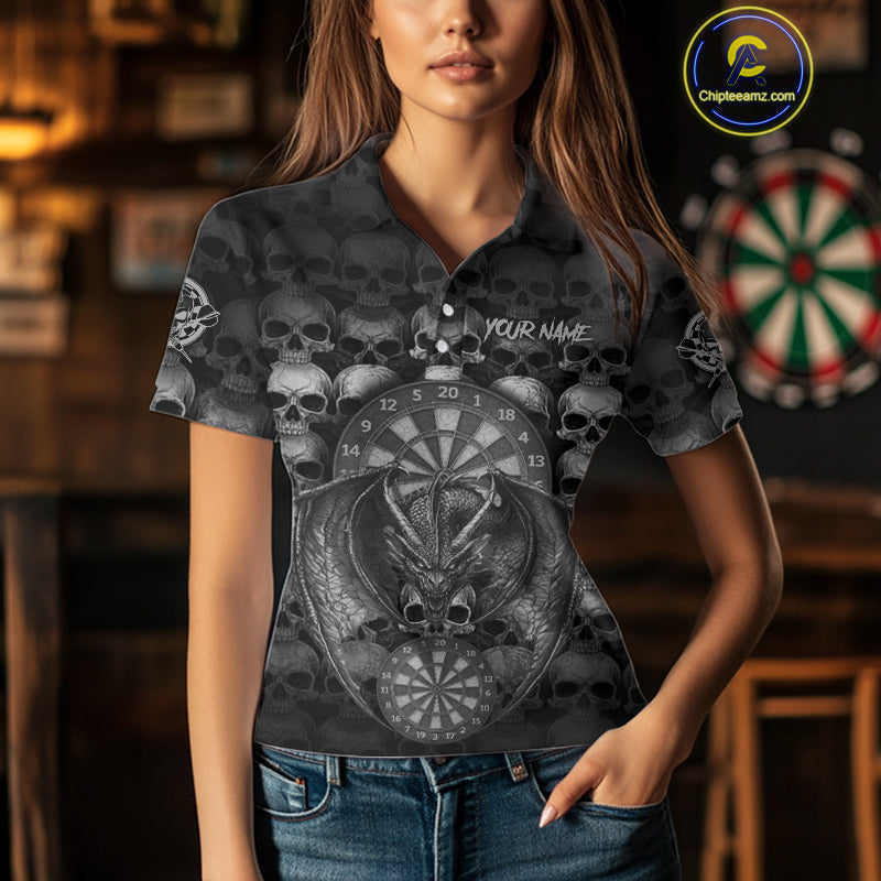 Grey Skull Pattern Dragon Darts League Shirt Custom Retro Skull Women Darts Polo Jersey NYN2049
