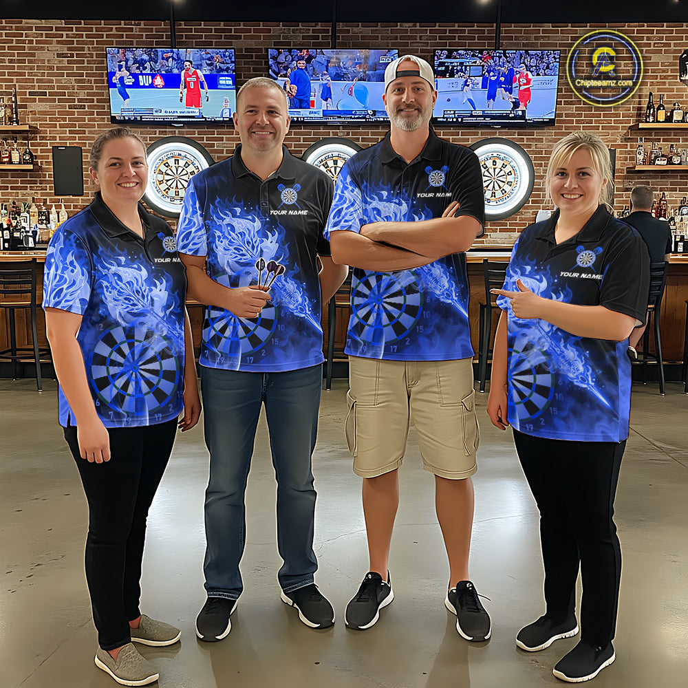 Custom Smoke Blue Fire Flaming Dart Arrow Women Darts Polo League Shirts Dart Team Jerseys NYN2215
