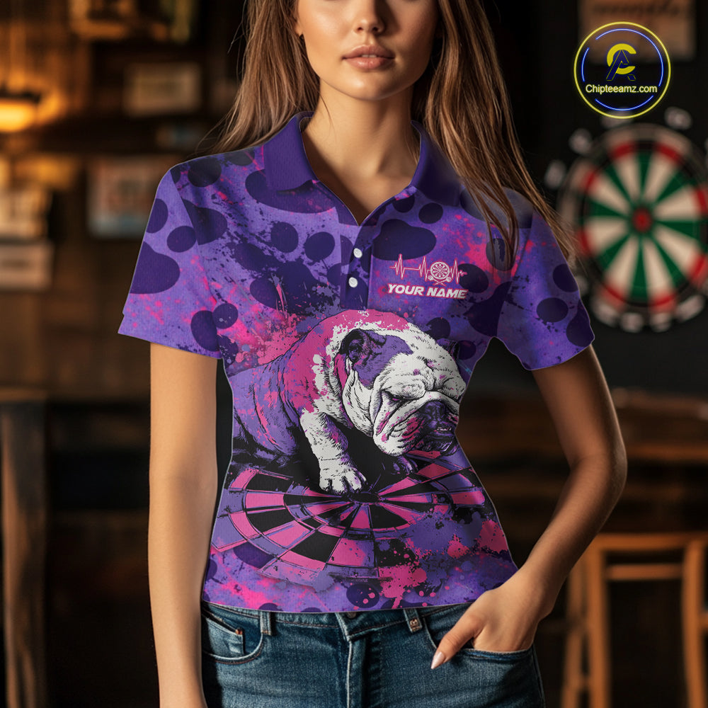 Pink & Purple Splatter Funny Lazy Bulldog Custom Women Darts Polo Shirts Dart League Jerseys NYN2256