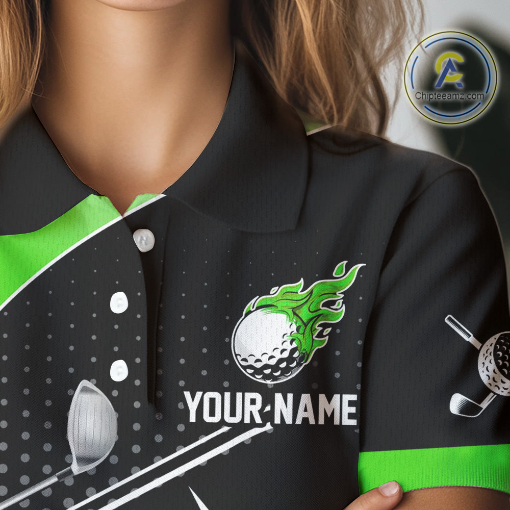 Black and Green Fire golf ball custom Women golf polo shirt, personalized ladies golf outfit for team NQS10123