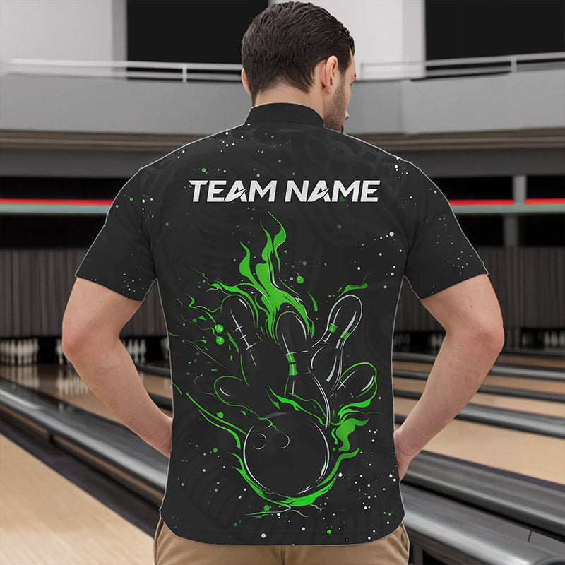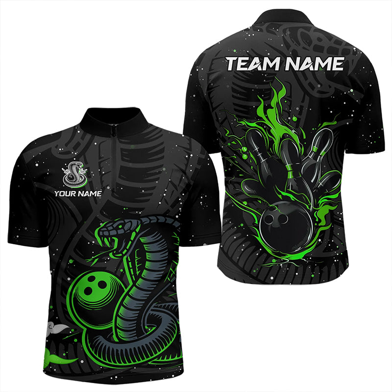 Black and Green Cobra Snake Bowling Polo, Quarter Zip Shirts For Men Custom Name Bowling Team Shirts NQS9655