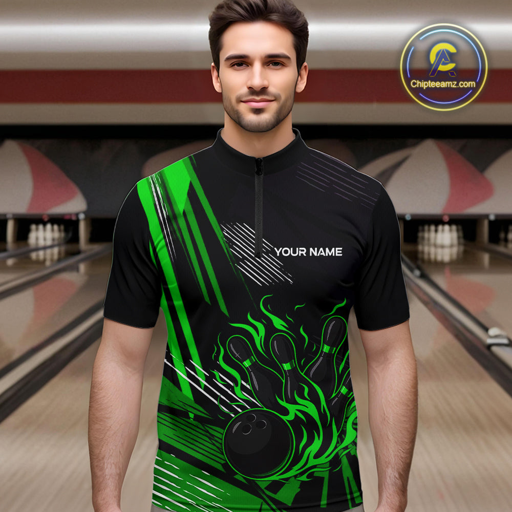 Black and Green Flame Bowling Polo, Quarter Zip Shirts For Men Custom Bowling Outfit Team Jerseys NQS10193