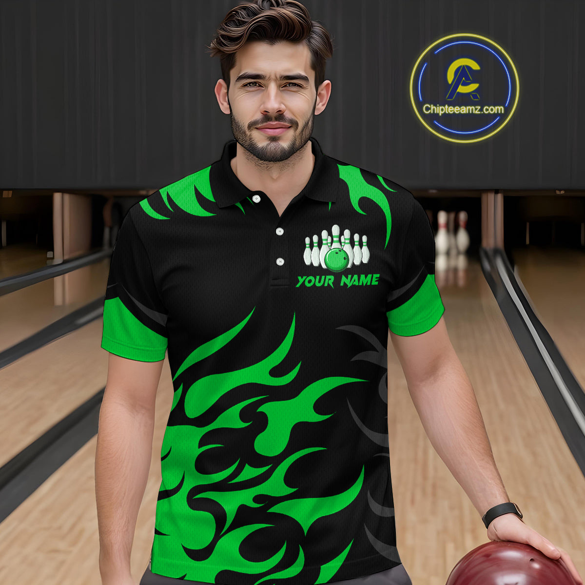 Black and Green Flame Bowling shirts for Men Custom team bowling jerseys, mens bowling apparel NQS10268