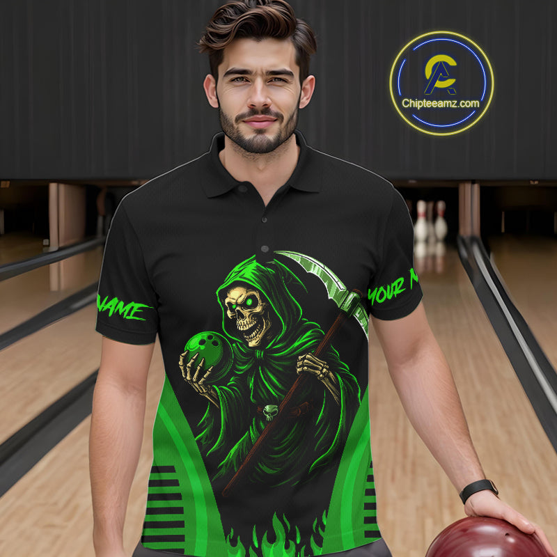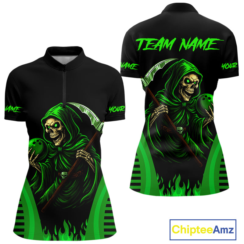 Black and Green Flame Skull Reaper Bowling Polo, Quarter Zip shirt for Men Custom team bowling jersey NQS10712
