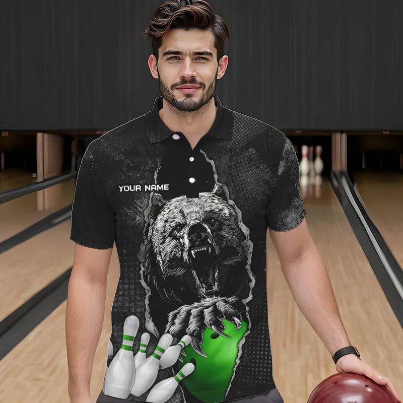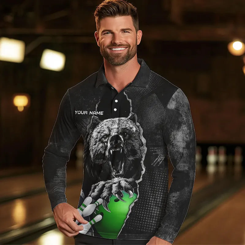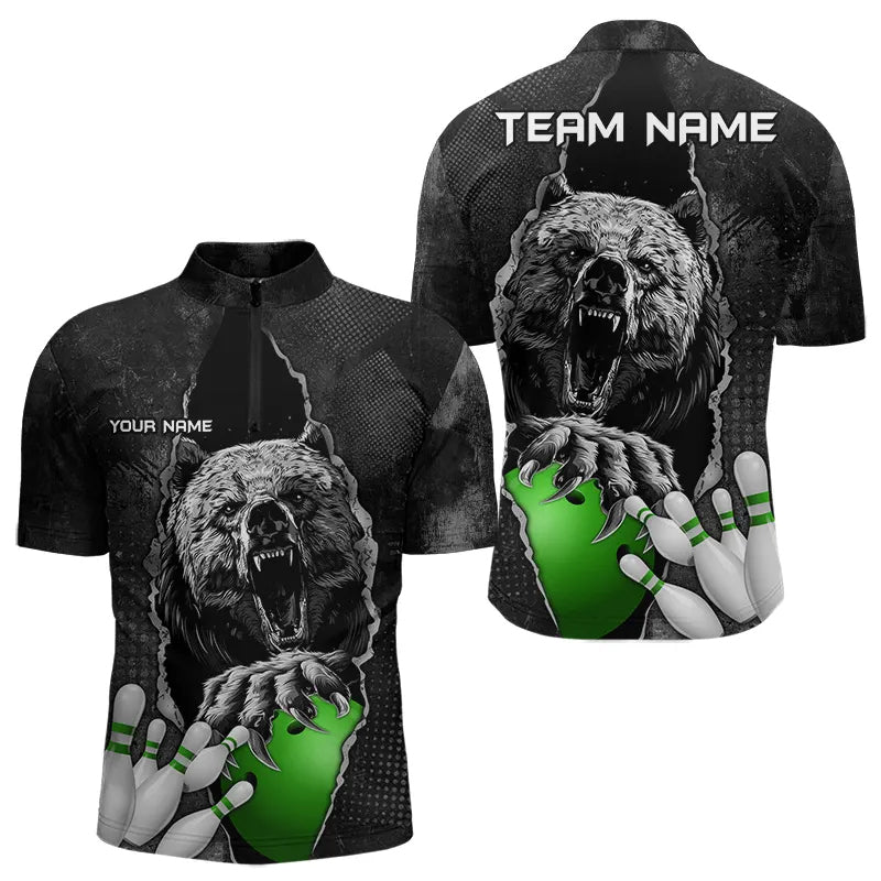 Black Bear grunge pattern Custom Men Bowling Polo, 1/4 Zip Shirts Bowling Team Jerseys Outfits | Green NQS9408