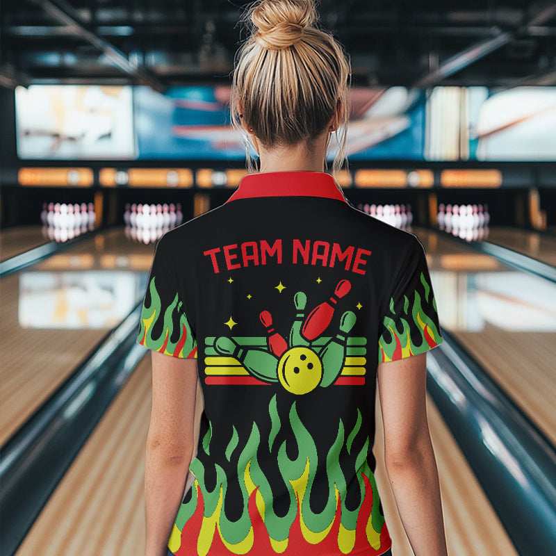 Black, Green and Red Flame Retro Bowling Polo, Quarter Zip Shirt for Women Custom Bowling Team Jerseys NQS9426